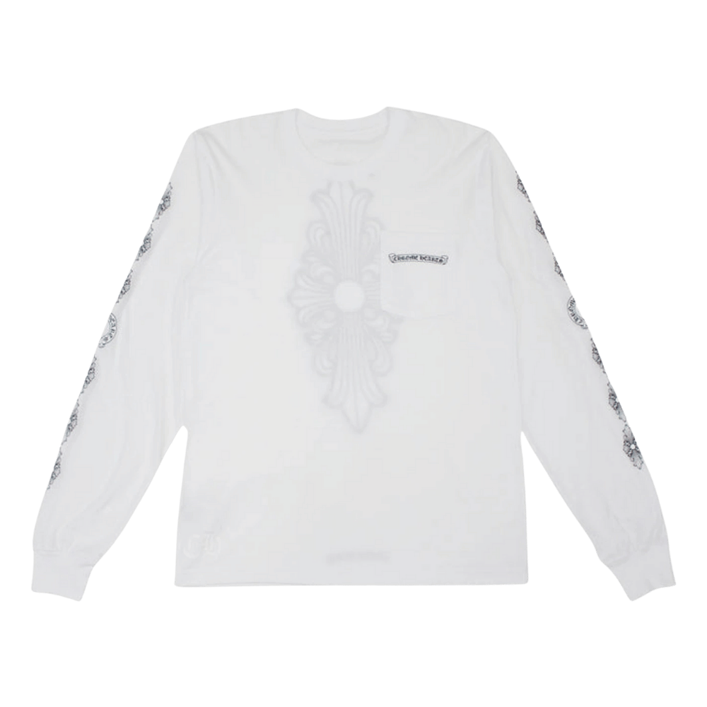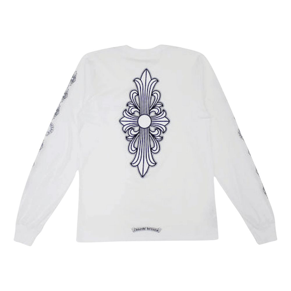 The Chrome Hearts Floral Cross Long Sleeve T-shirt in white is a unisex top made from 100% cotton. It features a bold floral cross print on the back and a smaller matching cross motif on the front. The long sleeves give it extra coverage and style, perfect for layering or solo wear.
