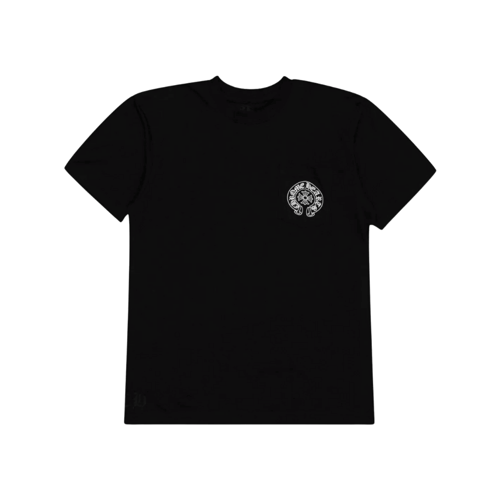 The Chrome Hearts Horseshoe Hong Kong Exclusive Tee in black is a unisex tee made from 100% cotton. It features a white Chrome Hearts horseshoe logo printed on both chest and back, with “Hong Kong” text under the back logo. The design is clean yet bold, perfect for streetwear style.