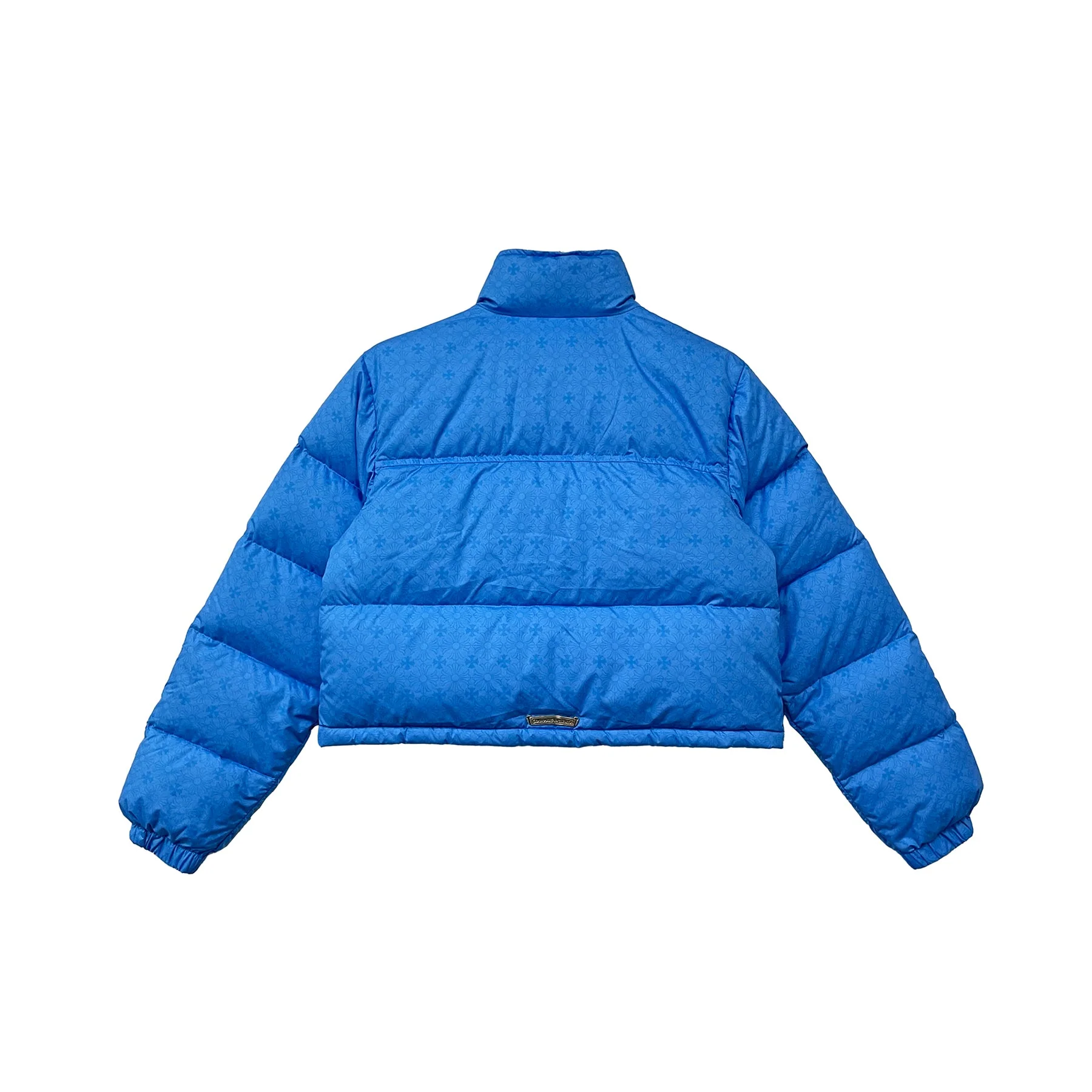 The Chrome Hearts Tonal Monogram Cross Pattern Puffer Short Jacket features a striking all-over monogram cross design and premium insulated construction. This blue short puffer blends luxury fashion with bold streetwear attitude for standout cold-weather style.